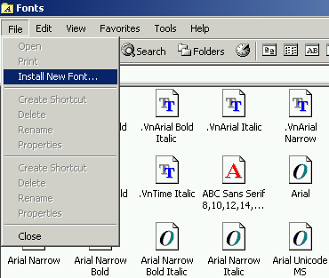 - Mở C:\WINDOWS\Font\, vào menu File chọn Install New Font Select, xuất hiện hộp thoại add Font, từ mục Folders chọn mục temp (có chứa file font chữ vừa copy vào), Chọn Select All, nhấn OK. Khởi động lại máy tính.